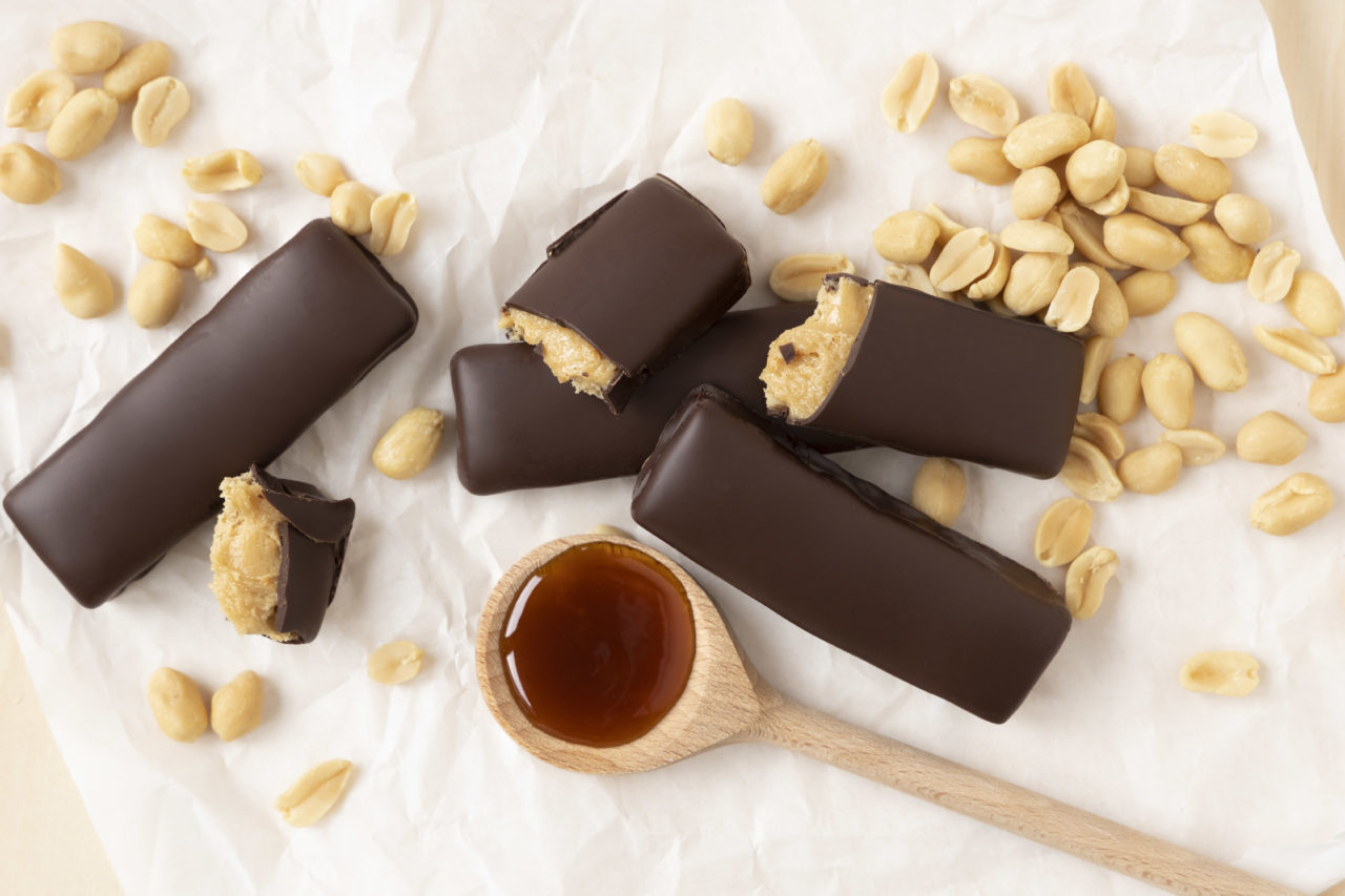 Rice syrup*, peanuts*, cane sugar*, cocoa mass*, soya protein*, agave syrup*, rice protein*, sunflower oil*, cocoa butter*, salt, emulsifiers: sunflower lecithins*, soya lecithins*. *certified organic May contain traces of nuts, sesame, cereals containing gluten, egg and milk.