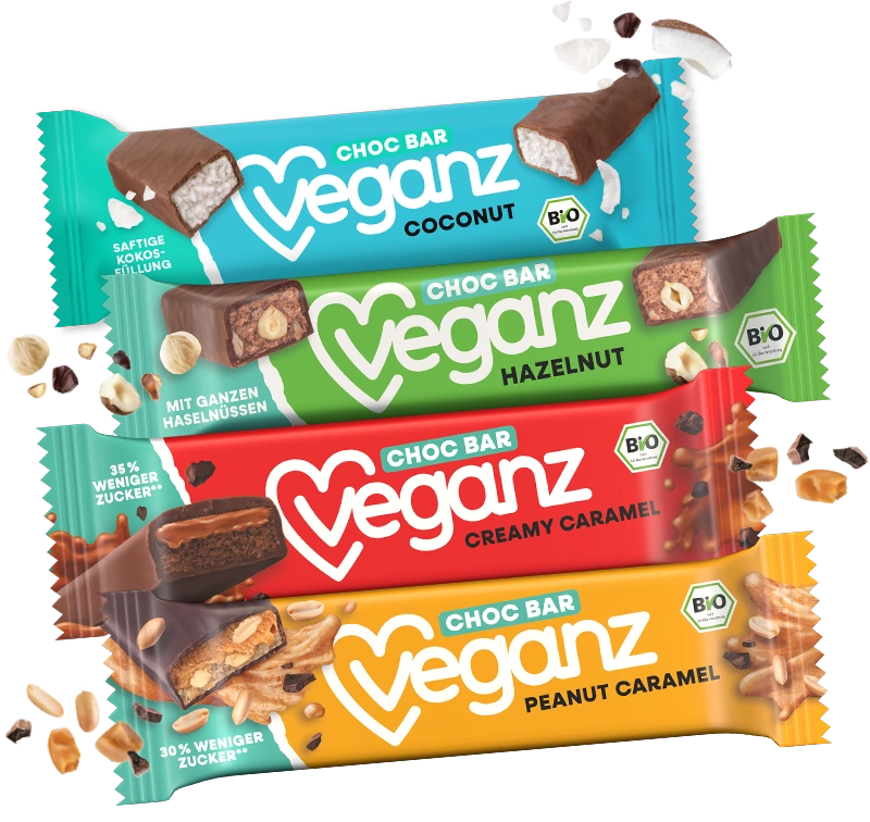 Choc Bar Creamy Caramel Coconut Original Choc Bar Peanut Caramel Roasted Hazelnut Classic No Added Sugar 80 g Hazelnut Brittle Coconut Choc Bar Hazelnut Choc Bar Strawberry Choc Bar Nutrition information Nutrition Information per 100 g Energy 1913 kJ 457 kcal Fat 21 g - of which saturates 9.8 g Carbohydrate 55 g - of which sugars 39 g Protein 9.9 g Salt 0.82 g Ingredients Reissirup*, Rohrzucker*, Kakaobutter*, Agavendicksaft*, Reisprotein*, Kakaomasse*, Sonnenblumenprotein*, MANDELN*, Sonnenblumenöl*, Tapiokaextrakt*, Dattelsirup*, Emulgator: Sonnenblumenlecithine*; Vanilleextrakt*, Salz, Aroma*. *aus kontrolliert biologischem Anbau. Kann Spuren von ERDNUSS, SOJA, anderen SCHALENFRÜCHTEN, SESAM, GLUTENHALTIGEM GETREIDE, EI und MILCH enthalten. 🛈 Available here REWE | DE kokku-online.de | DE Globus | DE Müller | DE coop | CH Budni | DE Spar | SI Amazon Fresh Vekoop | DE tegut | DE Carrefour | BH OS World of Sweets | DE Show more Nutrition information Nutrition Information per 100 g Energy 1765 kJ 428 kcal Fat 35 g - of which saturates 21 g Carbohydrate 37 g - of which sugars 0.8 g Protein 4.7 g Salt 10 mg Ingredients Cocoa butter* (26 %), sweetener: erythritol (23 %), wholemeal oat flour* (21 %), inulin*, cocoa mass* (15 %). *from organic agriculture. May contain traces of almond, hazelnut and milk. 🛈 Available here AEZ / HIT | DE kokku-online.de | DE Müller | DE Spar | AT Spar | SI REWE | DE Vekoop | DE EDEKA | DE OS World of Sweets | DE MPREIS | IT Show more Nutrition information Nutrition Information per 100 g Energy 1982 kJ 474 kcal Fat 24 g - of which saturates 7.6 g Carbohydrate 44 g - of which sugars 32 g Protein 17 g Salt 0.75 g Ingredients Rice syrup*, peanuts*, cane sugar*, cocoa mass*, soya protein*, agave syrup*, rice protein*, sunflower oil*, cocoa butter*, salt, emulsifiers: sunflower lecithins*, soya lecithins*. *certified organic May contain traces of nuts, sesame, cereals containing gluten, egg and milk. 🛈 Available here Lidl | CH REWE | DE kokku-online.de | DE Globus | DE EDEKA | DE Müller | DE dm | AT coop | CH Budni | DE Spar | SI Amazon Fresh Vekoop | DE tegut | DE OS World of Sweets | DE MPREIS | IT Show more It’s a hard nut life – which is why we’ve spared no effort by putting crunchy, finely roasted hazelnuts in this bar. Covered in an especially tender, melt-in-your-mouth chocolate, the Organic Veganz Roasted Hazelnut will truly candy-coat your life. Pretty sweet of us, huh? Nutrition information Nutrition Information per 100 g Energy 2437 kJ 587 kcal Fat 43 g - of which saturates 13 g Carbohydrate 38 g - of which sugars 32 g Protein 8.4 g Ingredients Cane sugar*, cocoa mass*, ground roasted hazelnuts* (19%), whole roasted hazelnuts* (17%), cocoa butter*. Chocolate contains: cocoa solids 51% minimum. Chocolate contains: cocoa solids 51 % minimum. *from organic agriculture May contain traces of almond and milk. 🛈 Available here shop.veganz.com Puroshop | CZ Rohlik | CZ Lidl | CH Kaufland | SK REWE | DE kokku-online.de | DE Globus | DE EDEKA | DE Müller | DE Kaufland | DE Spar | SI Amazon Fresh Vekoop | DE coop | DK Kaufland | CZ tegut | DE dm | CZ OS World of Sweets | DE Albert | CZ MPREIS | IT Show more The Organic Veganz Coconut Original is clear proof that happiness does grow on trees. More precisely, on cocoa trees and coconut palms – where the basic ingredients for our flavourful coconut chocolate bars come from! So, fancy a slice of happiness? Nutrition information Nutrition Information per 100 g Energy 2304 kJ 554 kcal Fat 37 g - of which saturates 26 g Carbohydrate 46 g - of which sugars 39 g Protein 5.2 g Salt 0.29 g Ingredients Coconut sugar*, cocoa mass*, desiccated coconut* (15%), cocoa butter*, coconut milk powder* (5,0%) (coconut milk* (82%), maltodextrin*), ground vanilla beans*. Chocolate contains: cocoa solids 48% minimum. *certified organic May contain traces of almond, hazelnut and milk. 🛈 Available here shop.veganz.com Puroshop | CZ Rohlik | CZ Lidl | CH AEZ / HIT | DE REWE | DE kokku-online.de | DE Globus | DE EDEKA | DE Spar | SI Amazon Fresh Vekoop | DE Spar Gran Canaria | ES MPREIS | IT Show more “Crr, crr, crr…” Hey, what’s all the crunching about? Uh, oh! It can only mean one thing: Veganz Organic Hazelnut Brittle is at that good, old crunchy fun again. Delicately caramelised hazelnuts in a crunchy chocolate coating – a vegan candy bar that couldn’t taste any better! And sound more natural. Nutrition information Nutrition Information per 100 g Energy 2321 kJ 554 kcal Fat 33 g - of which saturates 19 g Carbohydrate 60 g - of which sugars 51 g Protein 2.6 g Salt < 10 mg Ingredients Raw cane sugar*, cocoa butter*, cocoa mass*, rice syrup powder* (14%), hazelnut brittle* (8%) (raw cane sugar*, chopped hazelnuts* (27%), glucose syrup*, caramelized sugar syrup*), hazelnut paste*, vanilla extract*. Cocoa solids 40% minimum. *certified organic. May contain traces of other nuts, cereals containing gluten and milk. 🛈 Available here shop.veganz.com Puroshop | CZ Rohlik | CZ Kaufland | SK REWE | DE kokku-online.de | DE Globus | DE EDEKA | DE Müller | DE famila | DE Spar | SI Combi | DE Amazon Fresh Vekoop | DE Kaufland | CZ Carrefour | BH MPREIS | IT Show more Do you long for a never-ending summer? Are you dreaming of white sandy beaches, turquoise blue water and bountiful palm trees? Then you are definitely ready for a holiday and the organic Veganz Coconut Choc Bar – our crunchy chocolate bar with a creamy coconut filling. Take a bite, close your eyes and get comfy in the hammock! Nutrition information Nutrition Information per 100 g Energy 2375 kJ 572 kcal Fat 40 g - of which saturates 32 g Carbohydrate 44 g - of which sugars 36 g Protein 3.2 g Salt 0.11 g Ingredients Shredded coconut* (35%), cane sugar*, cocoa butter*, inulin*, dried rice glucose syrup*, cocoa mass*, roasted hazelnuts*, emulsifier: sunflower lecithin*; sea salt, ground vanillabeans*. Cocoa solids: 38% minimum in the couverture chocola