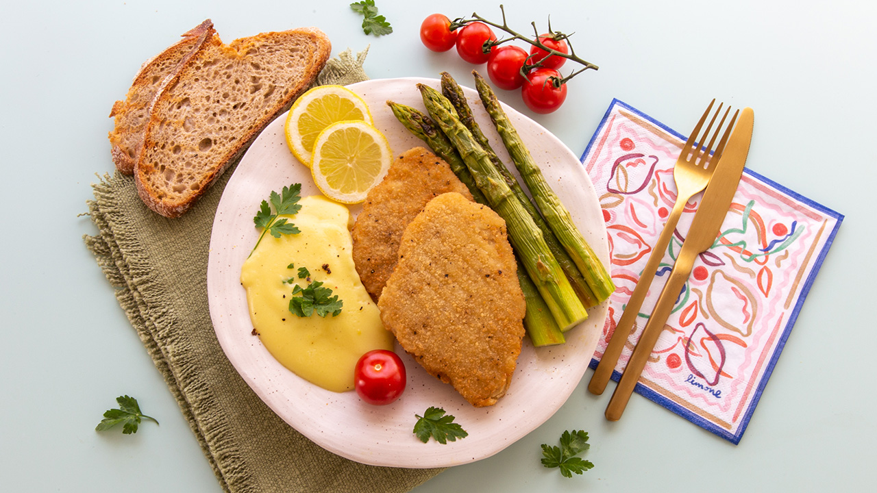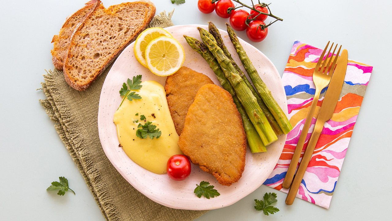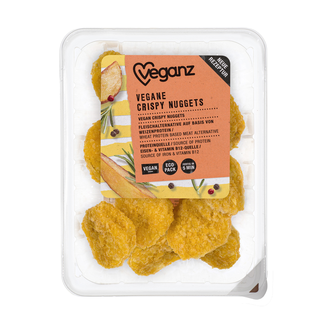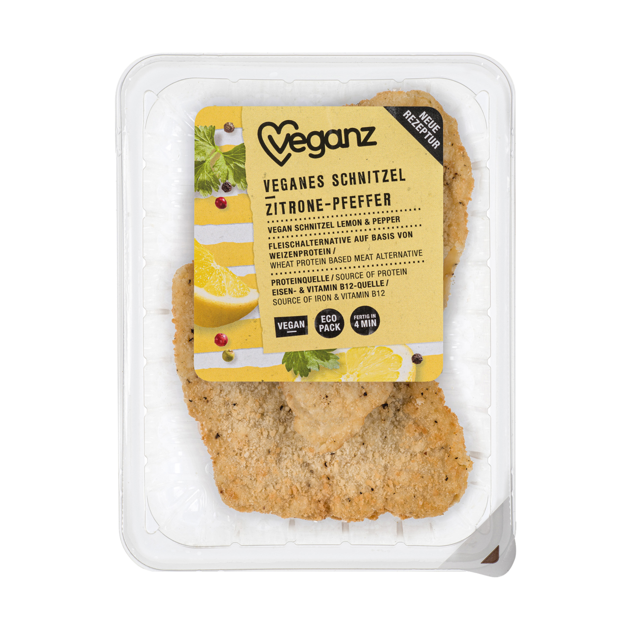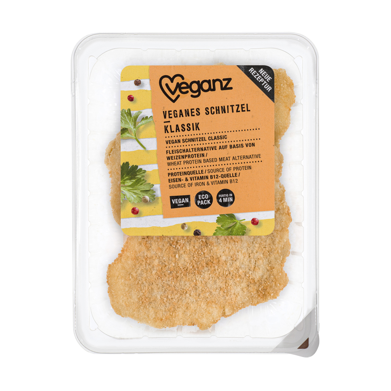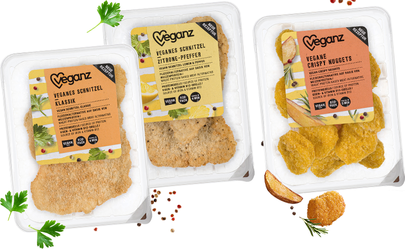 Vegan Classic Schnitzel Crispy Nuggets Vegan Lemon-Pepper Schnitzel Sissi might have loved our vegan Schnitzel even more than her Franz. Classic golden brown and juicy with a crispy breaded coating: unbelievably delicious. Nutrition information Nutrition Information per 100 g Energy 1145 kJ 274 kcal Fat 15 g - of which saturates 1.6 g Carbohydrate 22 g - of which sugars 0.4 g Protein 12 g Salt 1.1 g Iron 2.2 g Vitamin B12 0.55 g Ingredients Rehydrated soy protein (61%), rehydrated wheat protein (12%), crispy breaded coating (wheat flour, salt, yeast, sweet parika, herbs and spices), sunflower oil, wheat starch, wheat flour, thickener: methylcellulose; sea salt, natural aroma, herbs and spices, pea fibers, potatoe fibers, salt, corn starch, onion, garlic, maltodextrin, iron, vitamin B12. May contain traces of other cereals containig gluten, egg and milk. đ Available here REWE | DE AEZ / HIT | DE kokku-online.de | DE Spar | AT Spar | SI Amazon Fresh Vekoop | DE coop | DK EDEKA | DE MPREIS | IT Show more From this moment on we’ll never go without our weekly Schnitzel Day again! The Veganz Lemon-Pepper Schnitzel is always a great fit. Whether it’s with classic boiled potatoes and salad or simply as a snack in a sliced roll – the juicy delicacy is always a hit. Nutrition information Nutrition Information per 100 g Energy 1088 kJ 260 kcal Fat 13 g - of which saturates 1.5 g Carbohydrate 21 g - of which sugars 0.4 g Protein 12 g Salt 1 g Iron 2.1 g Vitamin B12 0.54 g Ingredients Redydrated soy protein (62%), rehydrated wheat protein (10%), wheat flour, sunflower oil, salt, thickener: methylcellulose; onion, black pepper (1,5%), corn flour, natural aroma, wheat starch, rapeseed oil, herbs and spices, dextrose, pea fibers, potato fibers, lemon powder (0,2%), lemon oil (0,1%), garlic powder, maltodextrin, iron, vitamin B12. May contain traces of other cereals containig gluten, egg and milk. đ Available here AEZ / HIT | DE REWE | DE kokku-online.de | DE Spar | AT Spar | SI Amazon Fresh Vekoop | DE EDEKA | DE MPREIS | IT Show more The Gold Rush is here again! Because now there are vegan nuggets! They are unbelievably juicy and have a super yummy crunchy coating. Truly every side dish wants to get next to them. Our suggestion: Salsa Nutrition information Nutrition Information per 100 g Energy 1042 kJ 249 kcal Fat 12 g - of which saturates 1.3 g Carbohydrate 21 g - of which sugars 1.6 g Protein 13 g Salt 1.5 g Iron 2.1 g Vitamin B12 0.54 g Ingredients Rehydrated soy protein (49 %), cornflakes (23 %) (corn, sugar, salt, barley malt extract), rehydrated wheat protein (13 %), sunflower oil, thickener: methylcellulose; salt, wheat Flour, natural flavourings, onion powder, potato fibers, dried glucose syrup, wheat starch, dextrose, corn starch, maltodextrin, spices, iron, cayenne pepper extract, herb extract, vitamin B12. May contain traces of egg and milk. đ Available here REWE | DE AEZ / HIT | DE kokku-online.de | DE Spar | AT Spar | SI Amazon Fresh Vekoop | DE coop | DK EDEKA | DE MPREIS | IT Show more