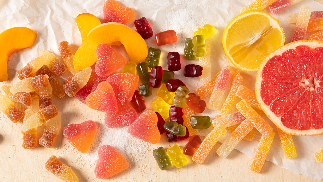 Glucose syrup, beet sugar, modified starch, gelling agent: carrageenan; acids: citric acid, malic acid; acidity regulators: sodium citrates, sodium malates; natural flavouring, natural grapefruit flavouring with other natural flavourings, colouring vegetable and fruit concentrates (carrot, pumpkin, apple), colour: anthocyanins. May contain traces of wheat.