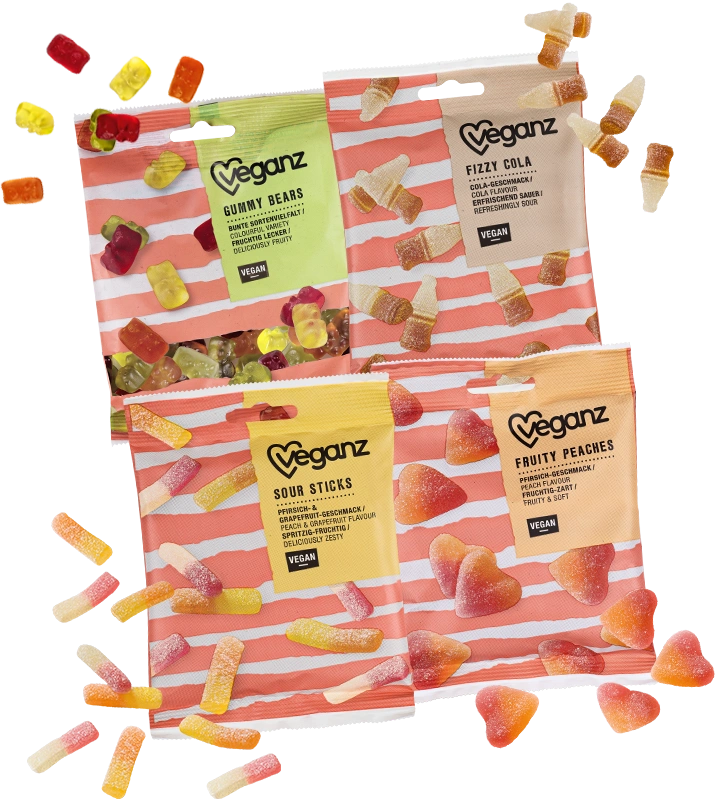 Sour Sticks Gummy Bears Fruity Peaches Fizzy Cola If your mouth tingles and your tongue prickles, it can only mean one thing: You’ve been snacking on Veganz Sour Sticks, your favourite sour candy. What makes it your all-time favourite? Most definitely the fruity peach and grapefruit taste! Well, are you ready for the next sour gums? Nutrition information Nutrition Information per 100 g Energy 1443 kJ 340 kcal Fat < 0.5 g - of which saturates < 0.1 g Carbohydrate 84 g - of which sugars 71 g Protein < 0.5 g Salt 0.88 g Ingredients Glucose syrup, beet sugar, modified starch, gelling agent: carrageenan; acids: citric acid, malic acid; acidity regulators: sodium citrates, sodium malates; natural flavouring, natural grapefruit flavouring with other natural flavourings, colouring vegetable and fruit concentrates (carrot, pumpkin, apple), colour: anthocyanins. May contain traces of wheat. 🛈 Available here shop.veganz.com Puroshop | CZ Rohlik | CZ Lidl | CH REWE | DE kokku-online.de | DE Globus | DE EDEKA | DE Müller | DE famila | DE Kaufland | DE Combi | DE Spar | SI Amazon Fresh Vekoop | DE coop | DK Carrefour | BH Lidl | DE OS World of Sweets | DE MPREIS | IT Show more Broken hearts? Not here! On the contrary, with us you can fall in love with sweet and juicy peach flavoured fruit gummy hearts – the Veganz Fruity Peaches. Wonderfully soft and heartily delicious! Nutrition information Nutrition Information per 100 g Energy 1444 kJ 340 kcal Fat < 0.5 g - of which saturates < 0.1 g Carbohydrate 84 g - of which sugars 71 g Protein < 0.5 g Salt 0.61 g Ingredients Glucose syrup, beet sugar, modified starch, gelling agent: carrageenan; acid: citric acid; acidity regulator: sodium citrates; natural flavouring, colouring vegetable and fruit concentrates (carrot, blackcurrant), colour: paprika extract; glazing agent: carnauba wax. May contain traces of wheat. 🛈 Available here shop.veganz.com Puroshop | CZ Rohlik | CZ AEZ / HIT | DE REWE | DE kokku-online.de | DE Globus | DE EDEKA | DE Müller | DE Budni | DE famila | DE Spar | SI Combi | DE Vekoop | DE tegut | DE Carrefour | BH Spar Gran Canaria | ES OS World of Sweets | DE MPREIS | IT Show more Colourful and strong as a bear: In this little bag you’ll discover vegan gummy bears in five fun and fruity flavours. Whether strawberry, orange, black currant, apple or lemon – our Veganz Gummy Bears will leave you begging for more! Which one do you reckon will be your favourite bear? Nutrition information Nutrition Information per 100 g Energy 1381 kJ 325 kcal Fat < 0.5 g - of which saturates 0.1 g Carbohydrate 79 g - of which sugars 59 g Protein < 0.5 g Salt 0.22 g Ingredients Glucose syrup, beet sugar, gelling agent: pectins; acid: citric acid; acidity regulators: sodium tartrates, potassium tartrates; natural flavourings, natural lemon flavouring, natural orange flavouring with other natural flavourings, colouring foods: concentrated elderberry juice, turmeric extract, spirulina extract; glazing agent: carnauba wax. 🛈 Available here shop.veganz.com Puroshop | CZ Rohlik | CZ AEZ / HIT | DE REWE | DE kokku-online.de | DE Globus | DE EDEKA | DE Müller | DE famila | DE Spar | SI Combi | DE Vekoop | DE Carrefour | BH Lidl | DE OS World of Sweets | DE MPREIS | IT Show more No one can blame you if you reach for one of our cola-bottles after a hard day – preferably several at once. Try the Veganz Fizzy Cola: Wonderfully lively and delicious. Just one taste and you’re back in a good mood! Nutrition information Nutrition Information per 100 g Energy 1449 kJ 341 kcal Fat < 0.5 g - of which saturates 0.2 g Carbohydrate 84 g - of which sugars 72 g Protein < 0.5 g Salt 0.59 g Ingredients Glucose syrup, beet sugar, modified starch, gelling agent: carrageenan; acid: citric acid; acidity regulator: sodium citrates; natural flavouring, caramelized sugar syrup; glazing agent: carnauba wax. May contain traces of wheat. 🛈 Available here shop.veganz.com Puroshop | CZ Rohlik | CZ AEZ / HIT | DE REWE | DE EDEKA | DE kokku-online.de | DE Globus | DE Müller | DE famila | DE Kaufland | DE Spar | SI Combi | DE Amazon Fresh Vekoop | DE coop | DK tegut | DE Carrefour | BH Spar Gran Canaria | ES Lidl | DE MPREIS | IT Show more